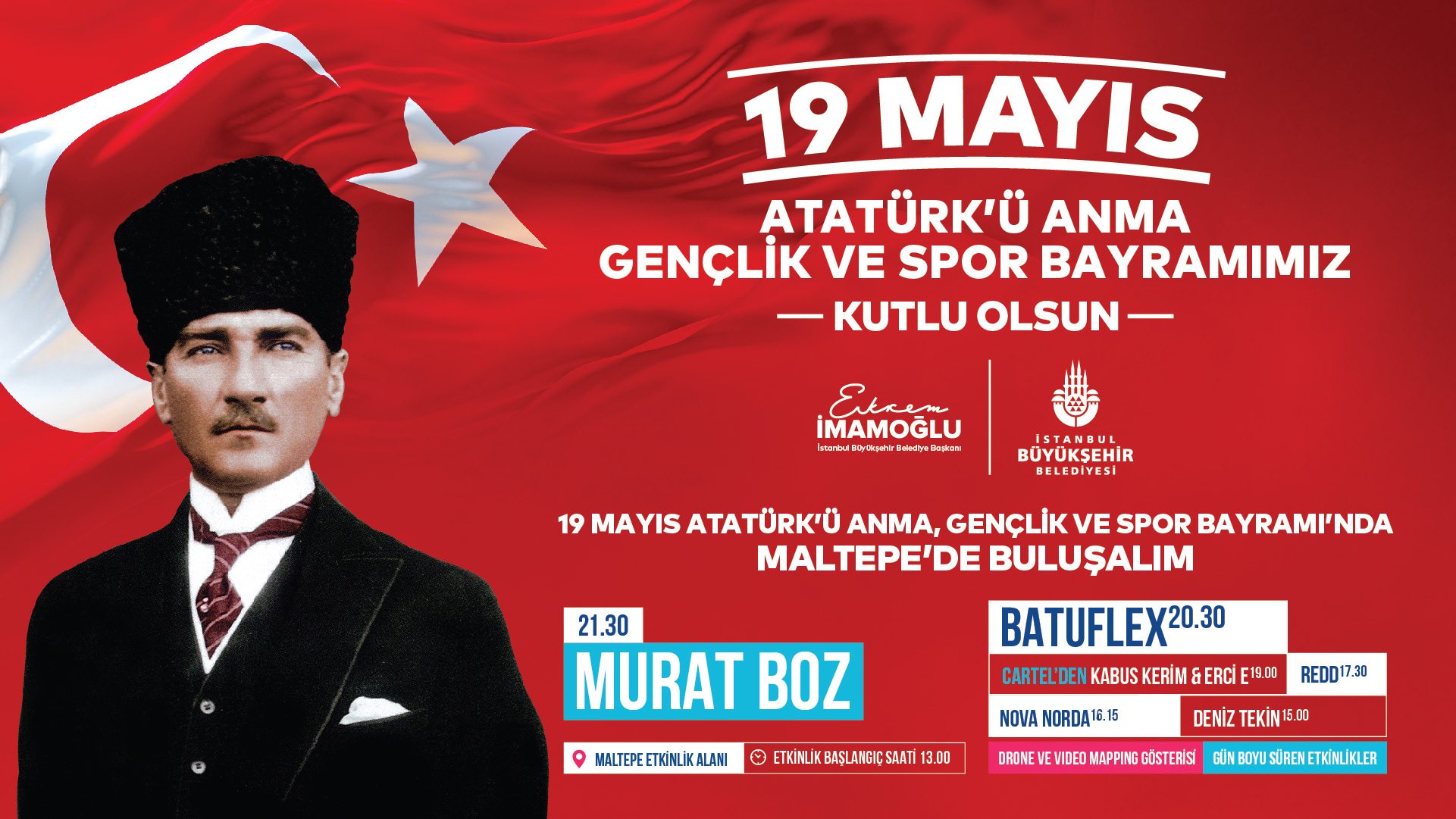 İstanbul Büyükşehir Belediyesi (İBB), 19 Mayıs Atatürk’ü Anma, Gençlik ve Spor Bayramı’nı coşkuyla kutlamaya hazırlanıyor! Maltepe Etkinlik Alanı’nda gerçekleşecek kutlamalar kapsamında, birbirinden renkli aktivitelerin yanında Deniz Tekin, Nova Norda, Redd, Cartel’den Kabus Kerim & Erci E ve Batuflex’ ve Murat Boz sahneye çıkacak.
