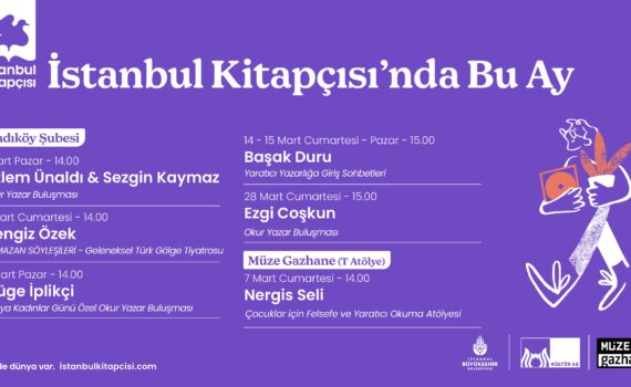 İstanbul Büyükşehir Belediyesi Kültür AŞ’ye bağlı İstanbul Kitapçısı, mart ayında edebiyatseverleri yazarlarla bir araya getirmeye devam ediyor. Kadıköy ve Müze Gazhane şubelerinde düzenlenecek etkinlikler, söyleşi, imza günü ve çocuk atölyeleriyle zengin bir program sunuyor.