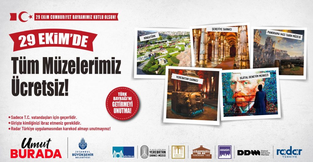 29 Ekim Cumhuriyet Bayramı, şehrin dört bir köşesinde coşkuyla kutlanacak! İstanbul Büyükşehir Belediyesi iştiraklerinden Kültür AŞ’ye bağlı Yerebatan Sarnıcı, Şerefiye Sarnıcı, Panorama 1453 Tarih Müzesi, Dijital Deneyim Merkezi ve Miniatürk, 29 Ekim Cumhuriyet Bayramı’nda T.C. vatandaşlarına kapılarını ücretsiz açacak. Ayrıca müzelerde gerçekleşecek etkinlikler ile ziyaretçiler, sanat, eğlence ve kültürün bir araya geldiği renkli bir programla buluşacak.