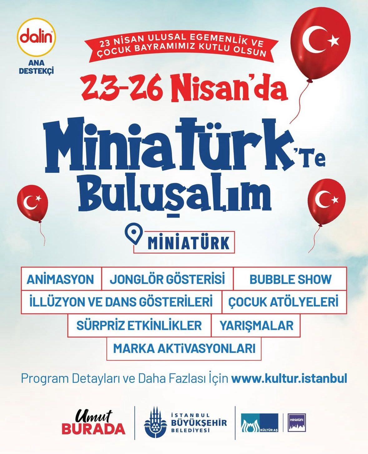 İstanbul Büyükşehir Belediyesi Kültür AŞ tarafından hazırlanan program kapsamında Miniatürk; Dalin’in ana desteğiyle sahne gösterileri, atölyeler, oyun alanları ve konserlerle zengin içerikleriyle her yaştan çocuğa hitap edecek. Bayram coşkusu, dört gün boyunca Miniatürk’te renkli etkinliklerle yaşanacak. Miniatürk’te yer alacak Sinebüs ise çocukları sinema ile buluşturarak ücretsiz film gösterimleriyle minik sinemaseverlere keyifli anlar sunacak.