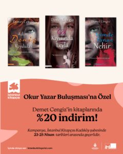 25 Nisan Cumartesi günü İstanbul Kitapçısı Kadıköy şubesinde gerçekleşecek etkinliğin konuğu, “Göl Kıyısında Leylâ” romanıyla dikkat çeken Demet Cengiz oluyor. Yağmur Eroğlu moderatörlüğünde gerçekleşecek söyleşide yazarın edebiyat dünyası ve son kitabı üzerine keyifli bir sohbet okurları bekliyor.