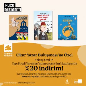 Okur Yazar Buluşması’na özel olarak, Yalvaç Ural’ın Yapı Kredi Yayınları’ndan çıkan tüm kitapları 30 Ocak – 1 Şubat tarihleri arasında İstanbul Kitapçısı Müze Gazhane şubesinde %20 indirimle okurlarla buluşuyor.