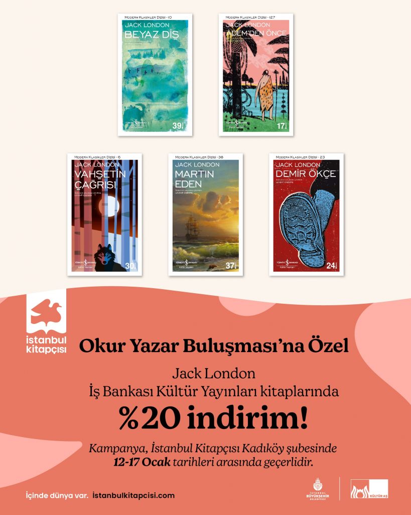 Okur Yazar Buluşması’na özel olarak 12 – 17 Ocak tarihleri arasında Jack London’ın İş Bankası Kültür Yayınları etiketiyle yayımlanan kitapları İstanbul Kitapçısı Kadıköy şubesinde %20 indirimli olacak. Edebiyatla dolu bu özel buluşmayı kaçırmayın!