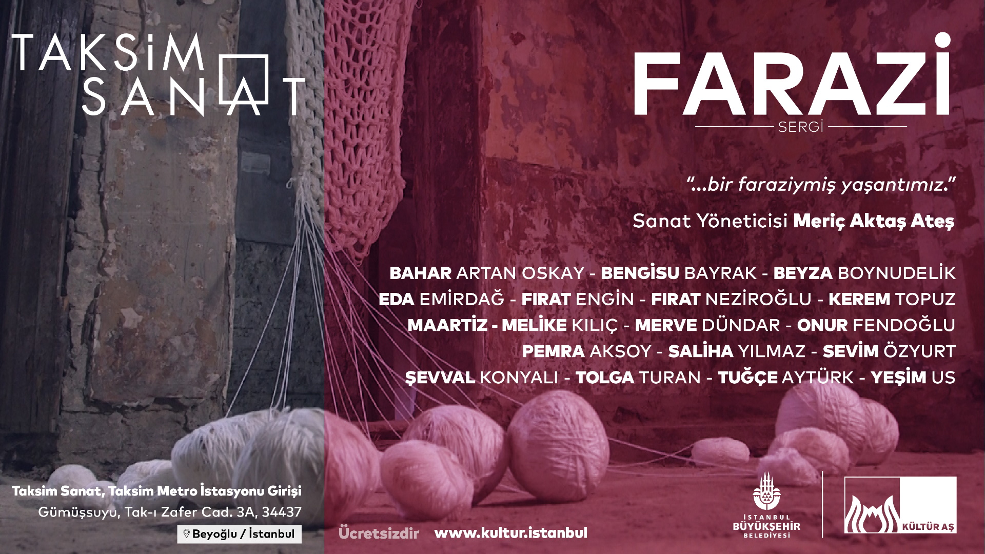 Bahar Oskay Artam, Bengisu Bayrak, Beyza Boynudelik, Eda Emirdağ, Fırat Engin, Fırat Neziroğlu, Kerem Topuz, Maartiz, Melike Kılıç, Merve Dündar, Onur Fendoğlu, Pemra Aksoy, Saliha Yılmaz, Sevim Özyurt, Şevval Konyalı, Tolga Turan, Tuğçe Aytürk, Yeşim Us’ un eserlerinin yer aldığı “Farazi” sergisi 31 Mart tarihine kadar Taksim Sanat’ta ücretsiz olarak ziyaret edilebilecek.