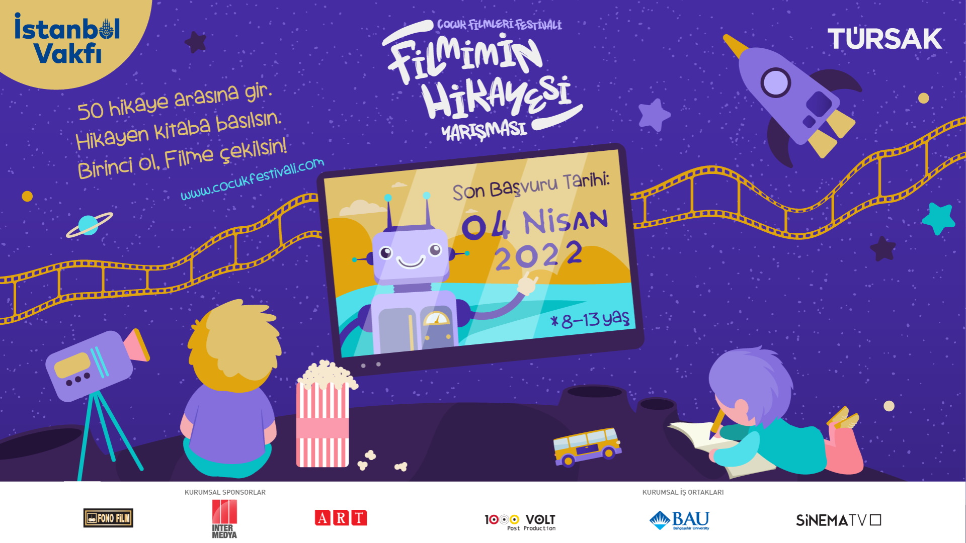 Türkiye Sinema ve Audiovisuel Kültür Sanat Vakfı (TÜRSAK) tarafından İstanbul Büyükşehir Belediyesi İstanbul Vakfı katkılarıyla düzenlenen ‘’Uluslararası Çocuk Filmleri Festivali’’ bu yıl da devam ediyor. 18’incisi gerçekleştirilecek olan festivalin ‘’Filmimin Hikayesi’’ bölümüne başvurular 4 Nisan tarihine kadar yapılabilecek.