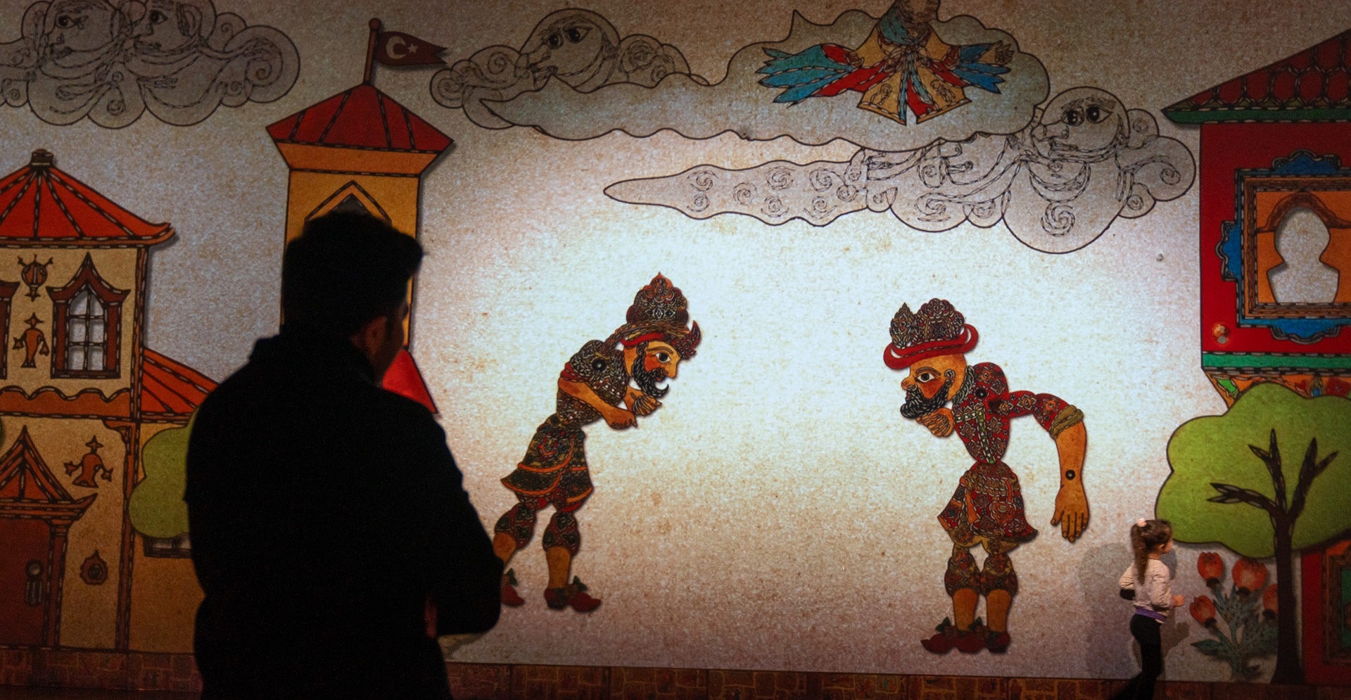 Sürükleyici Deneyim Odası: Geleneksel Karagöz ve Hacivat gölge oyunlarının dijital kukla ve tasvirlerle yeniden yorumlandığı “Çark-ı Müşa’şa” animasyonu, izleyicileri hikâyenin içine alan etkileyici bir deneyim sunuyor.