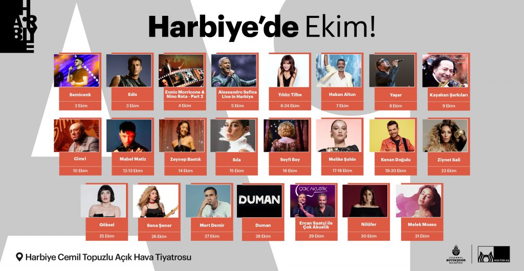 Dünya çapında ünlü sanatçılardan Türk müziğinin sevilen isimlerine uzanan geniş program, İBB Kültür AŞ’ye bağlı Harbiye Açık Hava’nın büyüleyici atmosferinde izleyicilerle buluşacak. Konserler, özel projeler ve eğlenceli performanslarıyla dolu takvim, İstanbul’un kültür sanat yaşamına renk katacak. Etkinliklere ait biletler Passo, Biletix, Biletinial’da!