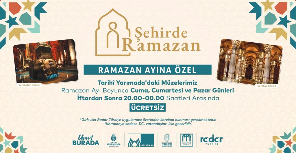 İBB Kültür AŞ, Ramazan ayı boyunca Yerebatan Sarnıcı ve Şerefiye Sarnıcı’nı ücretsiz ziyarete açıyor. Ramazan süresince cuma, cumartesi ve pazar günleri 20.00–00.00 saatleri arasında T.C. vatandaşları bu iki tarihî mekânı ücretsiz olarak ziyaret edebilecek.
