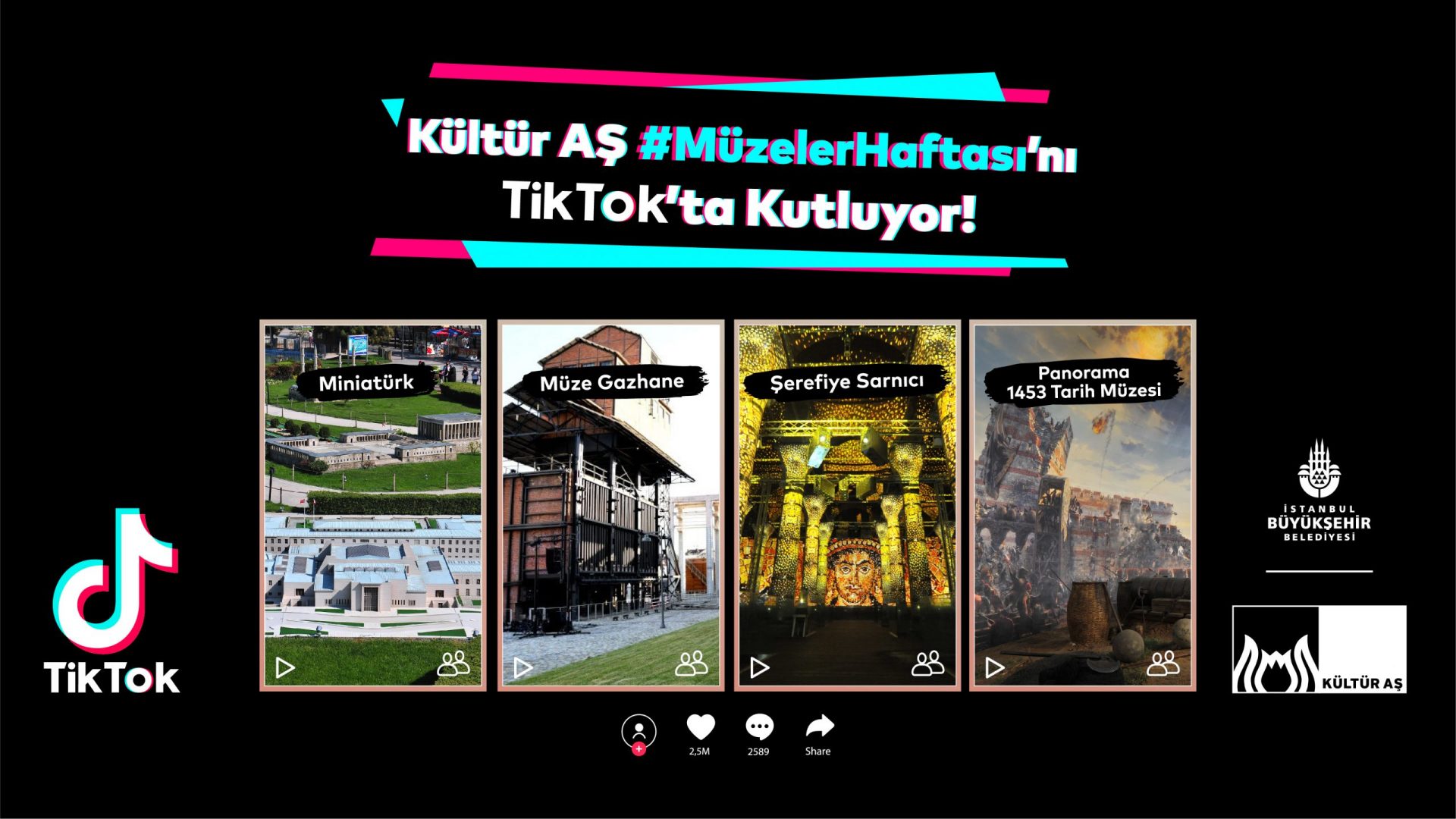 Kültür AŞ bünyesinde faaliyet gösteren Panorama 1453 Tarih Müzesi, Şerefiye Sarnıcı ve Miniatürk ile Müze Gazhane ile ilgili güncel bilgileri TikTok hesabımızdan takip edebilir, müze rotanızı planlayabilirsiniz. Ayrıca, 18-24 Mayıs tarihleri arasında online biletlerde (Passo), 18 Mayıs Müzeler Günü’nde ise tüm gişelerde geçerli %30 indirim fırsatını yakalayabilirsiniz. Ziyaretiniz sırasında müzelerimizde konumlandırılan TikTok noktalarına uğramayı ve video çekmeyi unutmayın.