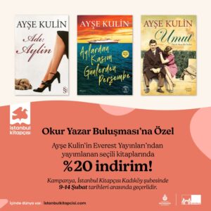İstanbul Kitapçısı Kadıköy şubesinde gerçekleşecek Ayşe Kulin ile Okur-Yazar Buluşması, Sevgililer Günü’nü edebiyatla renklendirmek isteyenler için özel bir etkinlik sunuyor. Bu özel buluşmanın yanı sıra, 9 – 14 Şubat tarihleri arasında Ayşe Kulin’in Everest Yayınları’ndan yayımlanan seçili kitaplarında %20 indirim de sizi bekliyor.