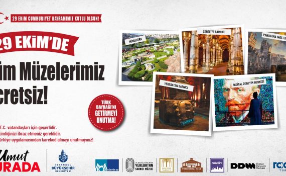 29 Ekim Cumhuriyet Bayramı, şehrin dört bir köşesinde coşkuyla kutlanacak! İstanbul Büyükşehir Belediyesi iştiraklerinden Kültür AŞ’ye bağlı Yerebatan Sarnıcı, Şerefiye Sarnıcı, Panorama 1453 Tarih Müzesi, Dijital Deneyim Merkezi ve Miniatürk, 29 Ekim Cumhuriyet Bayramı’nda T.C. vatandaşlarına kapılarını ücretsiz açacak. Ayrıca müzelerde gerçekleşecek etkinlikler ile ziyaretçiler, sanat, eğlence ve kültürün bir araya geldiği renkli bir programla buluşacak.