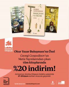 Okur–Yazar Buluşması’na özel olarak, 27–29 Kasım tarihleri arasında Gospodinov’un Metis Yayınları’ndan çıkan tüm kitapları İstanbul Kitapçısı Kadıköy’de %20 indirimle raflarda olacak.
